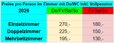 Anreise ist Donnerstag ab 16.00 Uhr. Eine Anreise am Freitag ist nur noch möglich, wenn nicht alle Zimmer belegt werden können. Die Zimmerschlüssel gibt es von mir, eine Anmeldung an der Rezeption ist nicht nötig. Abendessen gibt es ab 17.30 Uhr. Gespielt werden kann mit open End. Frühstück gibt es von 7.30 Uhr bis 9.30 Uhr, Mittagessen ab 11.30 Uhr. Die Mahlzeiten werden immer in Buffetform für uns vorbereitet, wobei das Salatbuffet sowohl mittags als auch am Abend seinesgleichen sucht. Getränke zu zivilen Preisen stehen in den Spieleräumen bereit.